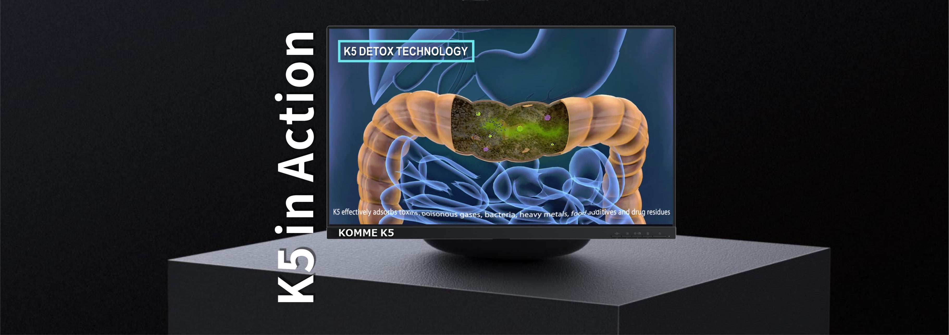 In clinical use, physicians rely on medical expertise and empirical data to give patients two weeks of KOMME K5 usage before medical treatment. K5 utilises its medical-grade intelligent colon positioning technology and its patented unique PBET nano porous technology to adsorb toxins and discharge them safely. This prevents toxins and drug residues from circulating in the patient before subsequent treatment.
